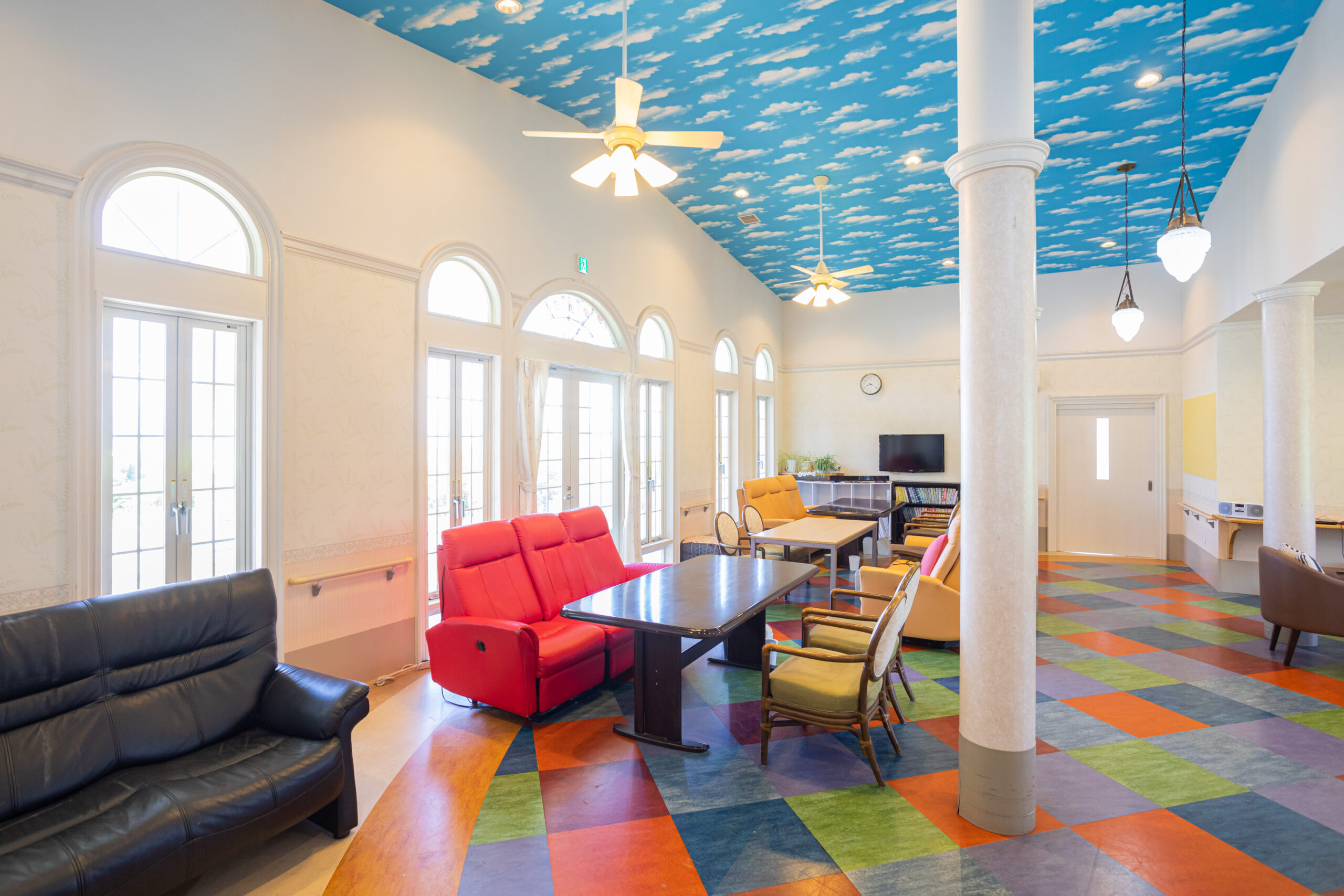 会津平野が一望できる景観を望むことができる解放感のあるデイサービスセンターです。おしゃれな西洋調の建物のなかではカフェのように心地よくリラックスできる空間が特徴的です。
