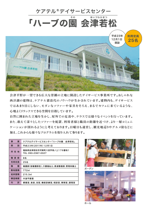 | 事業 | ケアテルデイサービスセンター「ハーブの園 会津若松」 |